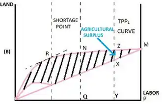 After AD, MP begins to rise, and industrial labor rises from zero to a value equal to AD. AP of agricultural labor is shown by BYZ and we see that this curve falls downward after AD. This fall in AP can be attributed to the fact that as agricultural laborers shift to the industrial sector, the real wage of industrial laborers decreases due to shortage of food supply, since less laborers are now working in the food sector. The decrease in the real wage level decreases the level of profits, and the size of surplus that could have been re-invested for more industrialization. However, as long as surplus exists, growth rate can still be increased without a fall in the rate of industrialization. This re-investment of surplus can be graphically visualized as the shifting of MP curve outwards. In Phase2 the level of disguised unemployment is given by AK.[4] This allows the agricultural sector to give up a part of its labor-force until