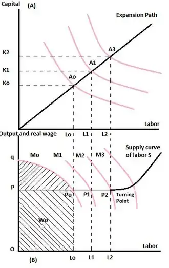 MPPL curves corresponding to their respective capital and labor levels have been drawn as Mo, M1, M2 and M3. When capital stock rises from Ko to K1, the marginal physical productivity of labor rises from Mo to M1. When capital stock is Ko, the MPPL curve cuts the labor supply curve at equilibrium point Po. At this point, the total real wage income is Wo and is represented by the shaded area POLoPo. λ is the equilibrium profit and is represented by the shaded area qPPo. Since the laborers have extremely low income-levels, they barely save from that income and hence industrial profits (πo) become the prime source of investment funds in the industrial sector.