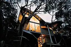 The overriding approach of the design, was to have minimal impact on the natural beauty of the site. It is virtually a treehouse, constructed on a central core, with large cantilevers extending from the centre. Steel construction is very appropriate for a bushfire-prone area and is further enhanced through the specific roof design. Conventional gutters have been eliminated; through the device of the major curved roof forms, directly flowing onto a “flat” tapered tray system, allowing positive water and leaf run-off, into just one large downpipe, which empties into a grated sump. There are three connected “pavilions” for balance between communal and private areas.[16]