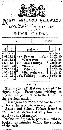 - ^ "WANGANUI-MANAWATU RAILWAY. TIME TABLE. WANGANUI HERALD". paperspast.natlib.govt.nz. 21 May 1878. Retrieved 21 January 2021.
