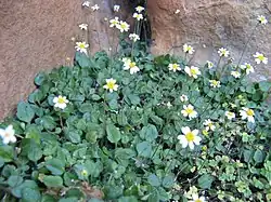 Felicia cymbalariae, is a hairy perennial herbaceous plant of up to 30 cm (12 in) high in the family Asteraceae. It has creeping branches that bend upwards, stalked leaves of up to 6 × 4½ cm (2.4 × 1.8 in) with few teeth or nearly entire. The flower heads are set individually on top of up to 8 cm (3 in) long stalks and contain about sixteen white ray florets of about 6 × 1½ mm around a center with many yellow or dark wine red disc florets. It can be found in the Western Cape province of South Africa. Flower heads can be found between September and June.[1][2]