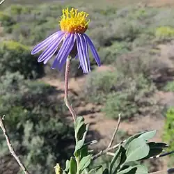 Felicia dregei is an evergreen, glandular shrub of up to 11⁄2 m (5 ft) high, that is assigned to the family Asteraceae. It has flat, finely felty, grayish green, narrowly elliptic to lance-shaped leaves of up to 4 cm (1+1⁄2 in) long and 8 mm (1⁄3 in) wide, with an entire margin or here and there with up to ten teeth. The flower heads have about ten violet ray florets, encircling many yellow disc florets. This species grows in the Northern Cape and Western Cape provinces of South Africa.[2]