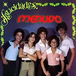 ¡Felicidades! is the fourth studio album and the first Christmas-themed album by the Puerto Rican boy band Menudo, released in 1979 by the record label Padosa.[1] It features the Meléndez brothers—Carlos, Óscar, and Ricky—along with Fernando Sallaberry and René Farrait. This was the last album to feature Carlos Meléndez, as he reached the group's age limit of 15 in early 1980 and was replaced by Johnny Lozada.[2]