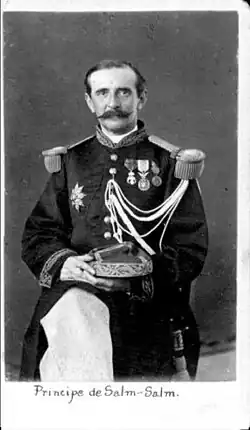 After the American Civil War was over, Salm-Salm offered his services to the Habsburg's Emperor Maximilian I of Mexico,[1] and embarked for Mexico in February, 1866. Maximilian was actively promoting American soldiers to migrate to Mexico after the war to improve relations with the country. Salm-Salm was in an unusual position because he had fought for the Union while most of the Americans who moved to Mexico after the Civil War had fought for the Confederacy. By the summer he was appointed colonel and became the Emperor's aide-de-camp[1] and chief of household. He was captured at Querétaro along with the emperor but not before he made a brave charge with his hussar cavalry in an attempt to save Maximilian from the surrounding Mexican Republican army under Benito Juárez. Together with the Emperor and his highest-ranking generals Tomás Mejía Camacho and Miguel Miramón he was sentenced to death by firing squad. Thanks to the tireless efforts of his wife (who had also tried to obtain a pardon for the Emperor Maximilian) he was pardoned by Juárez and released from custody in December 1867. During his captivity, he was promoted to the rank of brigadier general.[4]