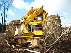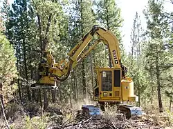 Feller is a traditional name for someone who cuts down trees,[1] and bunching is the skidding and assembly of two or more trees.[2] A feller buncher performs both of these harvesting functions and consists of a standard heavy equipment base with a tree-grabbing device furnished with a chainsaw, circular saw or a shear—a pinching device designed to cut small trees off at the base. The machine then places the cut tree on a stack suitable for a skidder, forwarder, or yarder for transport to further processing such as delimbing, bucking, loading, or chipping.
