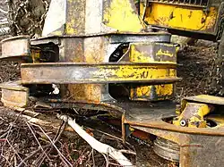 Disc saw head – It can provide a high speed of cutting when the head is pushed against the tree.[7] Then, the clamp arms will hold the tree when the tree is almost completed cutting. It is able to cut and gather multiple trees in the felling head. The disc saw head with good ground speed provides high production, which allows it to keep more than one skidder working continuously.[5][8]