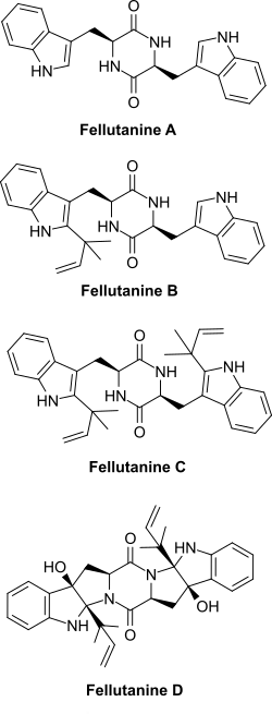 Fellutanine A,[1] B,[1] C and D are bio-active diketopiperazine alkaloids isolated from the cultures of Penicillium fellutanum,[2] that belongs to a class of naturally occurring 2,5-diketopiperazines.[3] Originally they were thought to be based on the "trans" cyclic dipetide cyclo(L-Trp-D-Trp) [2] but were later shown to be based on the "cis" cyclic dipetide cyclo(L-Trp-L-Trp).[4] This was also confirmed when fellutanine A, B and C were isolated from Penicillium simplicissimum.[5] The fellutanines A−C, are non-annulated analogues of cyclo(L-Trp-L-Trp), but unlike their diannulated analogue fellutanine D are not cytotoxic.