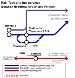 The station's track lay in the now abandoned Heathrow Airtrack plan proposed by BAA. Railways, for passenger trains, would have splayed out from Heathrow Terminal 5 to London Waterloo, Reading and Guildford, replacing express bus services, and the first listed of these running directly via (calling at) Feltham. BAA withdrew the Airtrack plan in 2011.[7]