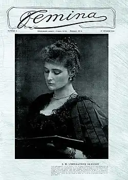 The title of this illustrated periodical is taken from the Latin word femina for "woman". It was subtitled "La revue idéale de la femme et de la jeune fille" ("The ideal magazine for women and girls") and was an early French magazine format targeting a female readership of the bourgeoisie. It won immediate success; by the end of its second year, it achieved a circulation of 100,000 and reached a high of 135,000 between 1905 and 1910, triple the sales of La Fronde and outselling influential daily newspapers Le Temps (36,000), Le Figaro (46,000) and L'Éclair (93,000).[2]