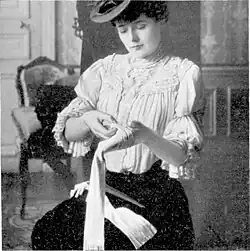 Femina projected a strong visual appeal. Current fashion in clothing and interiors was illustrated with photographs made, in the case of garments, in the studio or at social events (such as those taken at the races by the Séeberger Brothers)[5] and hand-drawn illustrations, including instructions on fitting garments; on the correct way to remove gloves, for example. Photographic portraits played a role in engaging readers with élite society figures and unpeopled pictures of their prestige home interiors appealed to aspirational readers' curiosity.[3] After a few years, the cover of the magazine, which was in most cases a photograph, was alternated with a bi-chrome comic illustration. In 1906, the cover of the November 1 number displayed drawing of a woman breastfeeding her child, signed by Paul César Helleu.