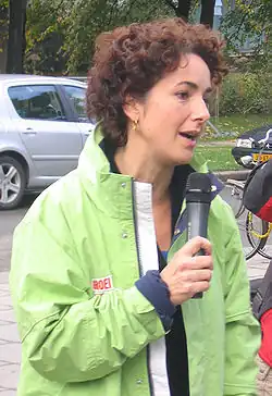 In the 2002 election, she was given the second place on the list. The party lost one seat. Halsema became vice-chair of the parliamentary party and among others spoke for the party in the first debate with the First Balkenende cabinet. In November of that year Paul Rosenmöller unexpectedly announced that he would leave politics. He asked Halsema to succeed him, and she immediately agreed. Ten days before the party congress she was announced as the only candidate for the party leadership and became top candidate for the 2003 election.[16] The party lost another two seats. In addition to the party leadership she was spokesperson on areas of culture and media, healthcare, spatial planning and the environment. As party leader she had a more prominent position and put forth a number of private member's bills, including one concerning judicial review and another that sets a fixed price for books (together with the leader of the Democrats 66 (D66) Boris Dittrich).