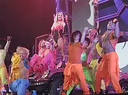 A video interlude in which the stalker talks about femme fatales throughout history introduces the third section of the show. Spears returns to the stage wearing a golden outfit and performs an Egyptian-inspired version of "Gimme More", which includes the use of pyrotechnics. In her next number "(Drop Dead) Beautiful" Spears is surrounded by her dancers carrying picture frames, and includes an appearance by Sabi in select cities. She then sings "He About to Lose Me" on a purple couch while her male dancers climb metallic structures. She wears a golden cape for a snake charming number of "Boys" (The Co-Ed Remix).[34] After climbing into a swing, she starts singing "Don't Let Me Be the Last to Know", while an acrobat hangs from it.[33] Another video interlude follows, featuring Spears changing clothes and choosing between different passports inside a hotel room. The show’s final segment features Spears and her dancers dressed in motorcycle gear to perform a medley of "...Baby One More Time" and "S&M", while her next number "Trouble for Me" features Spears and her dancers performing in the B-stage.[34] Accompanied by her female dancers, Spears performs "I'm a Slave 4 U" with gay soft porn in the backdrops,[35] and subsequently a cover of Madonna's "Burning Up" sitting atop a giant silver guitar.[33] She then brings several fans onstage for a performance of "I Wanna Go". She performs "Womanizer" with her dancers dressed as policemen and thanks the audience.[36] The encore starts with a video interlude of "Scary". The video ends with Spears finally capturing the stalker while wearing a kimono. She reappears to perform a martial arts-inspired version of "Toxic", in which she defeats a group of ninjas. At the end of the song, she goes below the stage and returns wearing a black sparkly bodysuit for "Till the World Ends". Halfway through the performance, Nicki Minaj appears on the backdrops rapping her verse of The Femme Fatale Remix of the song. She also joined Spears to perform the verse in select cities. After the song changes back to the original version, Spears starts flying on a platform with giant angel wings. The show ends with Spears and her dancers thanking the audience, as confetti falls and the "Femme Fatale" sign is lowered onstage.[33]