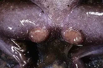 During mating, the femoral glands' placement on the male's ventral surface of the thigh suggests that they may contact the female's dorsal skin, implicating the glands in reproductive signalling.[7] Gland secretions may influence female behaviour, potentially stimulating oviposition and aiding intra-species recognition.[8] The variation of the femoral glands in the species Nyctibatrachus major may reflect hormonal regulation akin to thumb pad elaboration, a common secondary sex characteristic in male frogs. The size and function of femoral glands in N. major show seasonality and a correlation with reproductive activity, paralleling the strict seasonal changes in the Western Ghats environment. The presence of femoral glands in males of this species with small snout–vent lengths indicates that the development of these glands begins at a relatively early stage.[9]