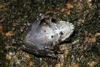 The role of femoral glands in facilitating amplexus (the mating clasp) among hill-stream anurans such as N. major has been proposed.[9] While these glands do not seem to be involved in the typical amplexus seen in Ranidae and Rhacophoridae, they are related to a more relaxed form of mating embrace. In this unique mating behaviour, observed solely in Mantellinae, males may drape their thighs over the female's head and shoulders if arboreal, or clasp the female briefly and loosely around the waist if terrestrial, with the mating grasp lasting only from a few seconds to minutes.[3]