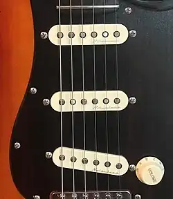 The Fender Noiseless series is a line of electric guitar pickups made by the Fender Musical Instruments Corporation designed to cancel 60 cycle (Hz) hum noise while retaining the characteristic sound of single coil pickups. Introduced in 1998, these pickups consist of a pair of single coils stacked one on top of the other, compacted so as to match the shape and width space as a traditional Fender single coil guitar pickup, while being only slightly taller. The upper coil is actually the sound source, while the lower coil is responsible for the mains hum attenuation. Alnico[1] 5 magnetic bars span from one coil to the other, crossing a soft ferrous steel spacer plate that isolates them, without touching it. The spacer plate has mainly two functions: to isolate the lower coil from the vibrations of the string, making sure that the sound is picked up only from the upper one, and to increase the magnetic flux that passed through both coils, increasing the output of the pickup. This is to be contrasted with the original noise canceling pickup, the humbucker, which is a double-wide, horizontally adjacent pair of single coil pickups with opposing phase.[2]