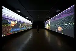 Long March: Restart continued this style and became a single player positioned video game. In 2008, this work was displayed for the first time on an 80-foot-long digital wall in MoMA PS1, New York. Viewers can take over a wireless controller and control the Red Army Soldier through 14 stages, which is familiar to Super Mario Bros.