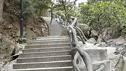 Although Fenghuang Mountain is not a very tall mountain, it has lush vegetation and is celebrated for its remarkable stones. One natural boulder is known as the "nodding oriole" (莺石点头) as it resembles an oriole's mouth. The stone's name was recorded by the 1676 jinshi Wen Chaoling (文超灵), and the stone is inscribed with verses written by a number of famous people. In addition, to the right of Fengyan Temple are two boulders folded together like clasped hands, known as the "clasped hands stones" (合掌石). In the crack between the two boulders is an inscription: "Phoenix feathers transform into a dragon" (凤毛神化度云龙). According to legend, on the cliff there is also a trace of the last Song emperor Zhao Bing's dragon robe, and it was therefore named the "cliff of the hanging dragon robe" (龙袍挂壁).[2][4][5]