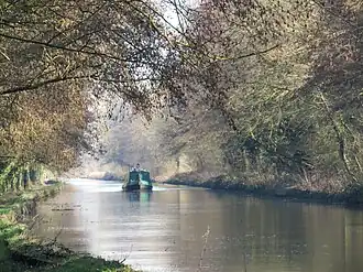 A decision that would affect the mosses was made in 1797, when the Ellesmere Canal company abandoned plans for a heavily engineered route to join the two halves of their system, which would have linked Trevor Basin to Chester, via Ruabon and Brymbo,[23] and decided instead to build a canal from Frankton Junction to Hurleston Junction, which was completed in 1805.[24] The engineers William Jessop and Thomas Telford decided against building a bypass around the mosses and instead elected to cut straight across the peat, despite the technical difficulties that this posed. They lowered the water table in the moss by building drainage ditches and then constructed a raft, on which the canal floated.[25] They understood that regular maintenance of this section would be a requirement for many years, and a team of navvies, later named the Whixall Moss Gang, were employed to extract clay from a pit on the Prees Branch.[26] The clay was used to build up the banks, and the gang were employed continuously from 1804 until the 1960s on this task.[27] Finally the engineering issues that created the work were solved, and the canal was underpinned with steel piling in the 1960s, to isolate it from the peat.[25] The idea that the drains defined in the 1823 Enclosure Act already existed is confirmed by the fact that they were carried under the canal in culverts when the canal was built across the edge of Whixall Moss in c.1801.[28]