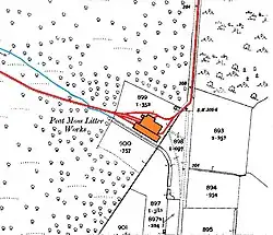 By 1884, George Wardle occupied Fenn's Hall, and started a moss litter business, producing peat for animal bedding. Two years later he was joined in the venture by William Henry Smith, an ironfounder from Whitchurch, and they set up The English Peat Moss Litter Company, which they formally registered on 12 May 1888. They leased land on the north-eastern part of Fenn's Moss from the Hanmer Estate, and in 1889, they obtained rights to the centre of Whixall Moss, by buying the Lordship of the Manor from William Orme Foster. This came with the obligation to maintain the drains, under the terms of the 1823 Enclosure Act, an issue that caused numerous disputes over the years. The company extracted peat from Fenn's Moss, and Wardle and Smith rented out parts of Whixall Moss to local turf cutters.[35] They built the Old Shed Yard Works, a little to the north of the Old Moss Works, and used horse-drawn tramways to transport the finished product away from the works. On the moss, tracks went to the north-west, turned to the south-west and then to the south-east, to reach Oaf's Orchard, on the border between England and Wales. From the works, another tramway headed northwards to Fenn's Bank Brick and Tile Works, where there was an interchange siding with the Cambrian Railway.[36]