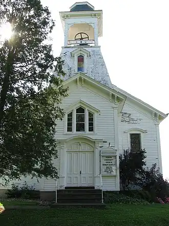 Fenner Baptist Church, also known as Fenner Community Church, is a historic Baptist church at 3122 Bingley Road in Fenner, New York. The original section of the church was built in 1820–1821 and is a 40 by 50 feet (12 by 15 m) and is a heavy hand-hewn, timber-frame structure. In the 1870s, the building was expanded by 10 feet (3.0 m) and acquired an overlay of Second Empire stylistic elements. The resultant building is three bays wide and four bays deep, with a gable roof and engaged, projecting central tower.[2]