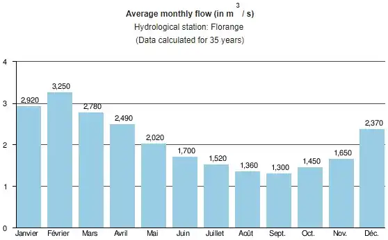 At low water level, the 3 consecutive-day minimum flow can drop to 0.54 cubic metres per second (19 cu ft/s) during a five-year dry period, which is far from severe. Floods are moderately important, given the small size of its watershed. They are proportionally more or less half as large as those of its neighbor, the Orne. The 2-year and 5-year peak instantaneous flows are 7.6 cubic metres per second (270 cu ft/s) and 9.5 cubic metres per second (340 cu ft/s). The 10-year peak flow is 11 cubic metres per second (390 cu ft/s), the 20-year peak flow is 12 cubic metres per second (420 cu ft/s) and the 50-year peak flow is 14 cubic metres per second (490 cu ft/s). The highest instantaneous flow recorded at Florange was 12.3 cubic metres per second (430 cu ft/s) on 12 April 1983, with an average flow of 11.5 cubic metres per second (410 cu ft/s) that day. This flood was of a two-year order, and therefore not at all exceptional.