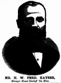 The Mount Bischoff tin deposit was discovered in 1873 by James "Philosopher" Smith, who formed a company two years later to extract the ore. Professor G. H. F. Ulrich[3] was brought in to assess the find, which was positive, and William M. Crosby was appointed mine manager, but was soon forced to resign on grounds of ill-health. At the insistence of Professor Ulrich (also from Clausthal) and Professor J. Cosmo Newbery, yet in the face of considerable opposition, Kayser was hired as mine manager. Confounding the doubters, Kayser built the township of Waratah and a railway to the coast, allowing the mine to prosper, making around £1,250,000 for its investors.[4]