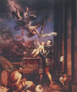 Born on 4 December 1571 at the Royal Alcázar of Madrid, Ferdinand was the eldest child of Philip II and Anne of Austria.[1][2] His mother was Philip II's niece and fourth wife.[3][4] His elder half-brother, Don Carlos, had died in 1568, which meant that he was the new heir-apparent at birth and therefore Prince of Asturias. To thank God for the birth of the long-awaited son, prisoners were released – as commemorated in Titian's painting, Philip II Offering Don Fernando to Victory.[5][6]