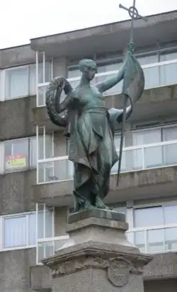 Folkestone, Kent | The Folkestone War stands in The Leas area of Folkestone in Kent and was unveiled on 1 December 1922 by the Earl of Radnor. A bronze figure representing "Motherhood" holds in one hand a pole with a flag at half mast and a cross. A victory laurel is raised in her other hand. She sits on a stone pedestal.[5]