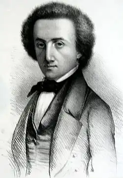 In Leipzig, Lassalle was often homesick and exasperated but rarely bored.[14] His diary entries from this period reflect his developing revolutionary fervour, particularly in response to the Damascus affair of 1840: "Cowardly race, you deserve no better fate! ... You were born to be slaves!" he wrote of the Jewish community's response.[14] He read Ludwig Börne's letters, seeing Germany as "one great prison where human rights are trodden under foot".[15] Heinrich Heine's poetry and Friedrich Schiller's play Fiesco also profoundly influenced him. After seeing Fiesco, he reflected, "Had I been born a prince I would have been an aristocrat heart and soul. As it is I am one of the middle classes, and, therefore, a democrat".[16] His reading of Johann Wolfgang von Goethe's Wilhelm Meister led him to contrast his own path with Meister's; while Meister renounced trade for Art, Lassalle felt he had renounced an "aesthetic life" for commerce to escape his "horrible position" at home.[17] However, he firmly believed that fate, or Providence, would lead him to a life concerned with "Freedom rather than markets".[18]