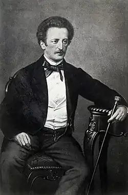 His social life in Berlin included an affair with Lina Duncker, wife of his publisher Franz Duncker.[73] This, and other social activities, caused friction with the Countess.[74] An altercation with an army officer, Fabrice, a rival for Lina Duncker's affections, led to a public scandal and a police expulsion order from Berlin.[75] Lassalle successfully appealed this order, partly through a petition to the Prince of Prussia.[76] His daughter by Agnes Dennis-Street died in September 1857, an event that seems to have had little impact on him.[77]