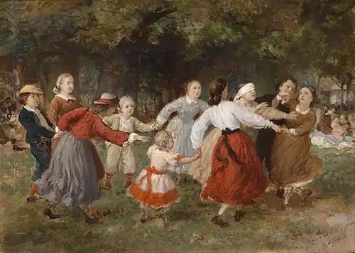 He continued to paint genre scenes as well, and his later ones tended to be humorous in character. He also designed the stained glass, created by Carl Geyling, in the Industrial Hall at the 1873 Vienna World's Fair.