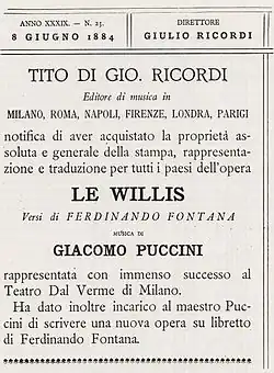 - Le Villi, music by Giacomo Puccini (Milan, 31 May 1884)