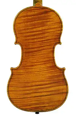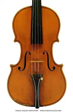 During his long career, his models and style remained almost unvaried. His work is meticulous, very precise and clean, always extremely careful and very elegant. He was discriminating in his choice of wood and he clearly preferred to fashion the backs out of one piece. He applied the varnish with great skill; this varies in consistency and colour depending on the period. The most usual colour is a beautiful red-orange which sometimes becomes lighter towards the centre but is sometimes a darker red. He also did much repair work and was considered an expert in old Italian violins. He often marked his instruments with a signed label and a brand on the inside.[1]