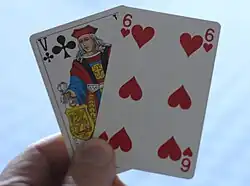 All 8s and 6s are removed from a standard 52-card pack with the exception of the ♥6, known as the 'brilliant one' (brillant) to leave 45 cards. As before, courts count 10 points and pips their face value. Again the player who bid the highest amount for the farm puts it aside to be won by the player who dispossesses the farmer. The rest ante a jeton to the pool or partie. The farmer shuffles the pack, has the player to the left cut them and deals one card each, anticlockwise beginning with eldest hand, the player to their right.[5]