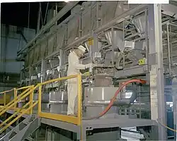 The production process at the Fernald Feed Materials Production Center began at Plant 1, also known as the Sampling Plant. The principal function of the Sampling Plant was to weigh, sample, classify and sort representative samples of the large quantities of incoming ore concentrates. Ore suppliers were paid based on the ore's uranium content.[24][25] The Sampling Plant had over 19,045 square metres (205,000 sq ft) of storage space, of which 3,879 square metres (41,750 sq ft) was under cover.[26]
