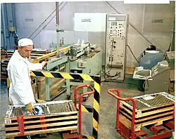 The FMPC had the equipment for rolling, forming, and machining uranium rods and slugs, but from 1971 on from they were sent offsite to Reactive Metals Inc. (RMI) in Ashtabula, Ohio, for extrusion into tubes and rods. A lathe was used to cut the tubes and rods into the appropriate length.They were then stamped for identification purposes, cleaned and degreased. The finished elements were checked for quality and then packaged and shipped to the Hanford and Savannah River sites.[38][39]