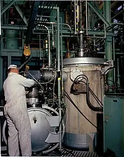 Plant 5, the Metals Production Plant, was where green salt was converted into metal. The conversion of UF to metal was accomplished by the thermite reduction of green salt with magnesium in a steel-lined reaction vessel known as a "bomb".[36] Green salt was mixed with magnesium granules and packed in the reaction pot, which was lined with magnesium fluoride slag and capped with slag. The pot was heated to 649 to 816 °C (1,200 to 1,501 °F) in a furnace. After about four hours a thermite-type reduction reaction occurs:[37]