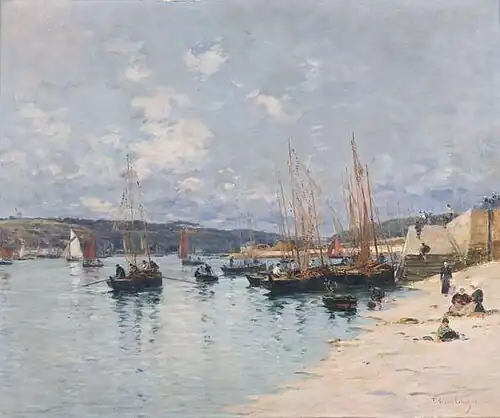Other paintings by Legout-Gérard include "Le marché à Concarneau", "Le quai Pénéroff", "Thoniers dans la baie du soir", "Etretat", "Thoniers, soleil couchant" and "Le marché à Quingamp". Gout-Gérard involved himself closely in the affairs of Concarneau. He was the president of the "Comité de la fête des Filets bleus" an organization which strove to improve the lot of the local fisherman and took an active interest in preserving Concarneau's ramparts. Apart from his Brittany paintings he painted in Normandy, Venice, Greece, and North Africa. An exhibition of his work was staged in 2010 at the Musée du Faouët.[3]