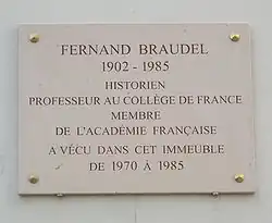 Braudel became the leader of the second generation of Annales historians after 1945. He defended his thesis at the University of Paris in 1947.[33] In that year, with Febvre and Charles Morazé, he obtained funding from the French government and the Rockefeller Foundation (which had previously supported the wartime exile École libre des hautes études in New York) to set up the Sixième section for economic and social sciences at the École pratique des hautes études (EPHE), which then became the funnel for all historical research in France.[34] In 1948, the Centre de recherches historiques was established there, with Braudel as its director.[35] In 1949 he was elected by the professors of the Collège de France as one of their number upon Febvre's retirement. He co-founded the academic journal Revue économique, in 1950.[36][37] He became the head of the Sixième section at EPHE after the death of Febvre in 1956 and attracted scholars such as Roland Barthes and Jacques Lacan to join its activities. He became the editor-in-chief of the Annales in 1957, which completed his rise to unrivalled influence on the development of the historical studies in France in the post-war years.[35] He received an additional $1 million from the Ford Foundation in 1960.[38]
