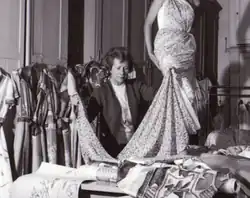 She continued to work for Ventura until the end of the Second World War in 1945.[3] The following year,[10] Gattinoni established her own self-named small atelier on the Via Marche.[3][9] During her time running her atelier, she designed costumes for Italian notability and foreign individuals such as Jacqueline Kennedy, the American First Lady, Eva Perón of Argentina, Princess Margaret, Countess of Snowdon and American Ambassador Clare Boothe Luce.[11] Gattinoni became notable in the 1950s and 1960s during the period of Hollywood on the Tiber,[7] where she had 25 embroiders working full-time on her gowns made of heavy taffetas and marocain and subsequently chiffon.[3][6] She was the designer of costumes worn on and off-camera by Ingrid Bergman, Lucia Bosè, Clara Calamai, Angie Dickinson, Ava Gardner, Gina Lollobrigida, Anna Magnani, Kim Novak, Elizabeth Taylor and Lana Turner.[7][8][9] The sister of the Shah of Persia wore a dress designed for her own wedding by Gattinoni.[3][6]