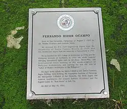 Fernando Hizon Ocampo, Sr., A.B., B.S.C.E., B.S. Arch., was born on August 7, 1897, in San Fernando, Pampanga, at the historic Hizon–Ocampo House he was the son of Dr. Basilio Ocampo a gobernadorcillo of San Fernando Pampanga and Leoncia Hizon-Ocampo. One of Manila's renowned architects and Civil Engineer. Ocampo was educated at the ADMU A.B., in 1914; UST College of Engineering, B.S. in Civil Engineering, 1919; and University of Pennsylvania, B.S. in Architecture, 1921. Following his graduation from the University of Pennsylvania, he worked in the Ballinger & Perrot Architects+Engineers office of Ar. Emile G. Perrot, AIA, ASCE and Ar. Walter F. Ballinger an architect and engineer in Philadelphia, Pennsylvania, and then spent two years traveling in Europe, giving particular attention to architectural designs. Returning to Manila he was for four years an assistant architect in the Bureau of Public Works. In 1927 he became associated with architect Tomas Arguelles and established Arguelles & Ocampo Architects.[1]