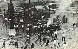 On 30 June 1960, a large demonstration summoned by the left-wing CGIL trade union and by other leftist forces in the streets of Genoa was heavily suppressed by the Italian police.[42] Other popular demonstrations in Reggio Emilia, Rome, Palermo, Catania, Licata again saw violent intervention by the police, causing several deaths. On 7 July, while news of the demonstrators killed in Reggio, Emilia arrived in the Chamber; Tambroni only spoke about "unpleasant incidents", stating the government's willingness was to do "its duty to defend the state and the free institutions".[43] Moreover, the interior minister, Giuseppe Spataro, accused the PCI of having stirred up the riots.[44]