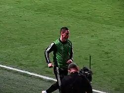 Torres was named in the FIFPro World XI for the second successive season in December 2009.[83] His stoppage-time winning goal against Aston Villa on 29 December 2009 made him the fastest Liverpool player ever to score 50 league goals.[84] He was substituted on 65 minutes in a 1–1 draw with Birmingham City on 4 April 2010, which Benítez justified by saying Torres was "exhausted".[85] Torres made his last appearance of the season scoring twice in a 4–1 victory over Benfica in the Europa League on 8 April 2010,[86] and it was announced on 18 April that he would miss the rest of the season to undergo knee surgery.[87] This meant that Torres finished the season with 22 goals in 32 games in all competitions, finishing as Liverpool's top scorer for the second time.[86]