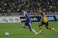 Torres made a scoring start to the 2008–09 Premier League season with a 25-yard shot into the bottom right-hand corner away at Sunderland, which was the only goal in a 1–0 win on 16 August 2008.[50] He suffered a hamstring tear in a 0–0 draw against Aston Villa, which would keep him out for two to three weeks.[51] Torres made his return in a 2–1 victory against Marseille in the Champions League and went on to score two goals in the Merseyside derby against Everton on 27 September 2008 to give Liverpool a 2–0 win.[52][53] He followed this up with another two goals the following weekend against Manchester City in a 3–2 win away at the City of Manchester Stadium as Liverpool came back from a two-goal deficit.[54] The first of these was the thousandth Liverpool goal to be scored in the Premier League.[55] Torres picked up a hamstring injury during a 2010 FIFA World Cup qualifier, meaning he was likely to miss three games for Liverpool.[56] On 22 October 2008, Liverpool played Torres's former club Atlético in the Champions League at the Vicente Calderón Stadium, but his injury meant he missed out on the game.[57] Atlético president Enrique Cerezo had given him a VIP invitation to watch the game, but he declined this to continue his rehabilitation from injury in Merseyside.[58] He was named in the FIFPro World XI team for the 2007–08 season on 27 October 2008.[59]