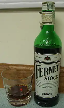 Fernet Stock is a herbal bitters made in Plzeň, Czech Republic. It is flavoured with approximately 14 herbs, imported from the Mediterranean and the Alps. It is also available in a sweeter form as Fernet Stock Citrus. The original Fernet is approximately 40% alcohol (Italian version 41%), whereas the Citrus is a lower 30%.