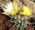 This cactus' flowers are large, usually 7 centimetres (2.8 in) to 8 centimetres (3.1 in), and display a yellow color with an inner scarlet color in some forms. This cactus also produces a fruit that is oblong, 2 centimetres (0.79 in) to 5 centimetres (2.0 in) long, fleshy, edible, and a dark brown to drab-color (not red). In addition to these features, its seeds are pitted.[2]