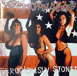 Ferociously Stoned was originally released on vinyl and CD by independent label Sub Par Records, the vinyl cover depicting three bikini-clad women clutching stones against a backwards American flag, and the subsequent CD release featuring only the band's name with censor bars over the words "Cherry" and "Poppin'". In March 1991, when the Daddies had temporarily shortened their name to "The Daddies" to alleviate the controversy surrounding their name, the album was re-released with the shortened band name and new cover art featuring a skeleton in formal wear, modeled after the Grateful Dead's "Uncle Sam" skeleton.[6][7] In 1994, coinciding with the release of the Daddies' second album, Rapid City Muscle Car, Ferociously Stoned was re-issued on CD, restoring the band's full name and including the tracks from their 1989 demo tape 4 From On High as bonus content.