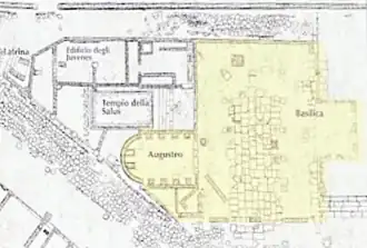 The basilica was built under Augustus and had a porticoed courtyard housing statues and honorary inscriptions. Under Tiberius the apsidal sacellum (small shrine) became an Augusteum in 14-20 AD and the staircase was blocked. The Augusteum was paved in colourful marble (opus sectile) and contained 12 statues. The basilica was repaved under Trajan.