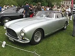 The 250 Europa, introduced at the 1953 Paris Motor Show, was the only one of the family to use a different engine, sporting the 2963 cc Lampredi V12 based on a design for Formula One 3.3 L engine. It was a square engine, with 68 mm (2.7 in) of bore and stroke, developing 200 PS (147 kW; 197 hp) at 6,300 rpm, with three Weber 36DCF (or DCZ) carburettors, and mated to a 4-speed transmission. With the long 2,800 mm (110.2 in) wheelbase and Ferrari 375 America-style bodies, it was designed as a grand tourer. Three different rear axle ratios were offered to customers, providing an estimated top speed between 180–217 kilometres per hour (112–135 mph) depending on the ratio.[7] Both 250 Europa and 375 America shared the same chassis, wheelbase and mechanicals apart for the engine.[8] The majority of bodywork were designed by Pinin Farina. Some had bodies designed by Giovanni Michelotti and constructed by Vignale. Styling resembled the 375 America and 340 Mexico coupes.[7] 22 were made, including 17 Pinin Farina-built coupes, 4 Vignale coupes, 1 Pinin Farina cabriolet and 1 Vignale cabriolet.[9] Two were later converted by the Ferrari factory to 375 America specification (chassis 0315AL and 0353EU).[10][11]