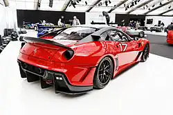 At the 2009 Geneva Motor Show,[26] Ferrari unveiled the track-only iteration of the 599 GTB, dubbed the 599XX. Designed by Ferrari's Formula-one engineers, the car has many changes over the standard car in order to make it more nimble and responsive on a race track. Exterior enhancements included two winglets on the C-pillars for improved downforce, a vented bonnet for improved engine cooling, darkened lexan tail lamps, a carbon fibre 'ducktail' rear spoiler aiding further in downforce, a large rear diffuser for improved under body airflow, tow hooks at the front and rear, additional ducts for improved cooling, a minimalist race interior with racing bucket seats along with an LCD display behind the steering wheel replacing all analogue gauges equipped with a roll-cage and lexan sliding windows. The car also has two fans that were located in the trunk and worked to keep the car on the ground and stopped working at speeds up to 250 km/h (155 mph), a speed at which the car needed no additional downforce. With all such components, the car was reported to generate 280 kg (617 lb) of downforce at 200 km/h (124 mph) and 630 kg (1,389 lb) of downforce at 300 km/h (186 mph). The air conditioning system was retained for added driver comfort. The car had nine traction and stability control modes, all controlled from the manettino dial on the steering wheel. The car was equipped with F1 inspired carbon ceramic brakes with crossed drilled rotors and a new race exhaust system. The rev limiter was raised to 9,000 rpm, with the engine rated at 540 kW; 720 hp (730 PS) at 9,000 rpm. Weight was reduced by reducing the weight of the engine components such as a new carbon fibre intake manifold and graphite coated pistons along with a lightweight crankshaft, as well as through the use of composite materials and the use of carbon fibre body parts. A new gearbox was introduced to cut overall gear change time to 60 milliseconds, holding the upward or downward shift paddle for longer resulted in multiple shifts that improved gearing time. The car also included 29/67 R19 front and 31/71 R19 rear racing slicks with 19 × 11J wheels at the front and 19 × 12J at the rear. The 599XX was capable of accelerating from 0–100 km/h (0–62 mph) in 2.9 seconds and attained a top speed of 315 km/h (196 mph) (redline limited top speed).[27]